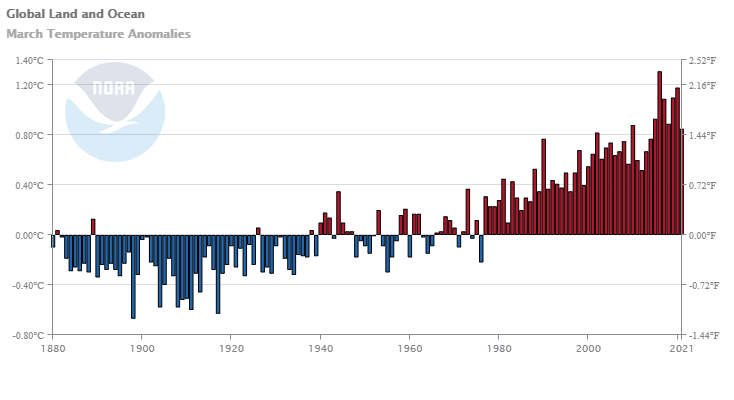 Marzo 2021, a livello planetario, è stato senz'altro caldo ma non caldissimo. Secondo le analisi dei ricercatori della NOAA, nella serie storica lunga 142 anni (dal 1880 a oggi), si colloca infatti all'ottavo posto tra i mesi di marzo più caldi, però è uno dei "freschi" degli ultimi anni: era dal 2014 infatti che lo scarto rispetto alla media del XX risultava più ampio di quello registrato quest'anno, e ciò significa che tra il 2015 e il 2020 le temperature medie di marzo era state più alte.